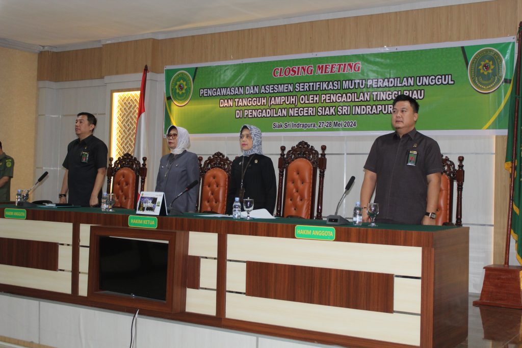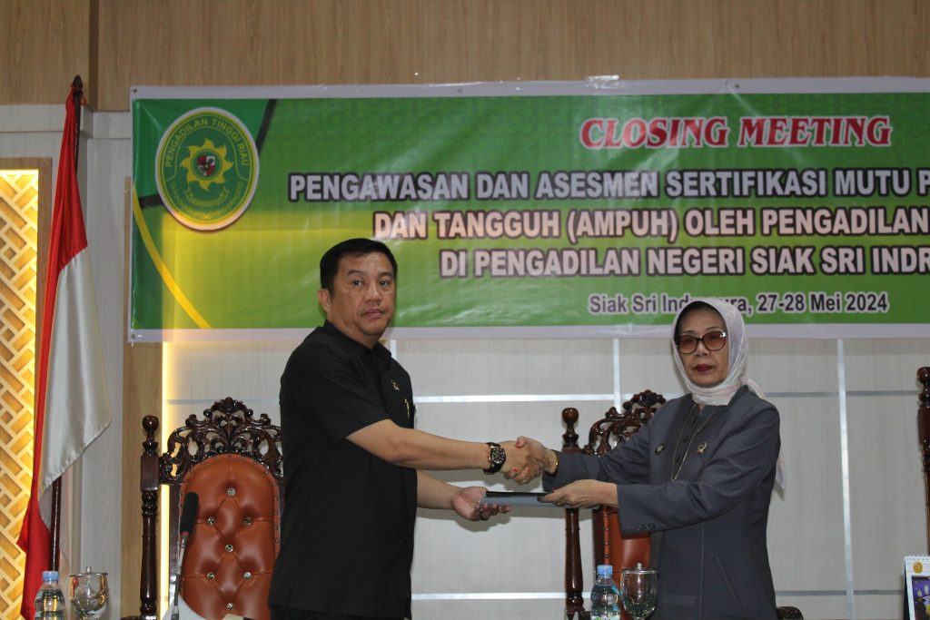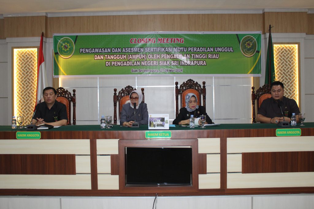 Siak Sri Indrapura โ 28 Mei 2024 Pengadilan Negeri Siak Sri Indrapura melaksanakan Closing Meeting Pengawasan dan Asesmen Sertifikasi Mutu Peradilan Unggul dan Tangguh (AMPUH) oleh Pengadilan Tinggi Riau di Pengadilan Negeri Siak Sri Indrapura di Ruang Sidang Utama Kantor Pengadilan Negeri Siak Sri Indrapura. Ketua Tim Asesmen menyampaikan hasil temuan dan bentuk rekomendasi terhadap termuan tersebut. Acara dilanjutkan dengan penandatanganan Kontrak Kerja, Berita Acara Serah Terima serta Penyerahan Laporan Hasil Pengawasan (LHP) dan Laporan Ketidaksesuaian Asesmen (LKA) oleh Tim Pengawas kepada Ketua Pengadilan Negeri Siak Sri Indrapura. Acara ditutup dengan foto bersama.
