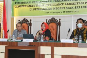 Siak Sri Indrapura – 21 Oktober 2022 Pembinaan Access To Justice Di Pengadilan Negeri Siak Sri Indrapura dipimpin langsung oleh YM Wakil Ketua Pengadilan Tinggi Riau Ibu Dr. Diah Sulastri Dewi, S.H., M.H. sesaat setelah dilakukannya Pendampingan Zona Integritas dan Surveillance Akreditasi Penjaminan Mutu di ruang sidang Cakra. Dalam Pembinaan tersebut YM Ibu Diah juga memberikan apresiasi terhadap kinerja dan kerja sama yang dilakukan oleh setiap bagian di Pengadilan Negeri Siak Sri Indrapura dan mengingatkan kembali untuk tetap menjaga kekompakan serta tetap bekerja solid dan akuntabel.