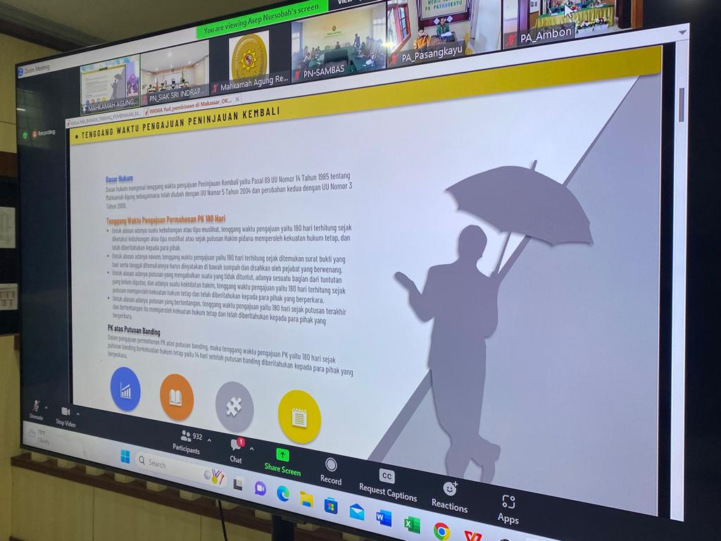 Siak Sri Indrapura – Kamis 06 Juli 2023 Pengadilan Negeri Siak Sri Indrapura mengikuti Pembinaan Teknis dan Administrasi Yudisial Secara Virtual Bagi Ketua, Wakil Ketua, Hakim, Panitera dan Sekretaris pada Pengadilan Tingkat Banding dan Tingkat Pertama untuk Empat Lingkungan Peradilan Seluruh Indonesia oleh Ketua Mahkamah Agung RI Bapak Prof. Dr. H. M. Syarifuddin , S.H., M.H.. Pembinaan secara virtual ini diikuti oleh Ketua Pengadilan Negeri Siak Sri Indrapura Bapak Muhammad Hibrian, S.H., Wakil Ketua Pengadilan Negeri Siak Sri Indrapura Bapak Ade Satriawan, S.H., M.H., para Panitera, Sekretaris dan Para Hakim di Ruang Sidang Cakra. Dalam Pembinaan ini terdapat beberapa poin penting yang disampaikan antara lain seperti Keberlanjutan Sistem Peradilan Elektronik, Pemanggilan dan Pemberitahuan Putusan Melalui Surat Tercatat, Â Penunjukan Majelis Hakim Menggunakan Artificial Intelligence (AI), Pembacaan Amar Putusan Perkara Kasasi dan Peninjauan Kembali Secara Online/ Live Streaming. Dalam sambutannya juga YM Ketua Mahkamah Agung RI menegaskan betapa pentingnya peranan pemanfaatan Teknologi Informasi pada masa kini khususnya di lingkungan badan peradilan dan mengajak seluruhnya untuk ikut berkontribusi dalam pemanfaatan dan penggunaan Teknologi Informasi.