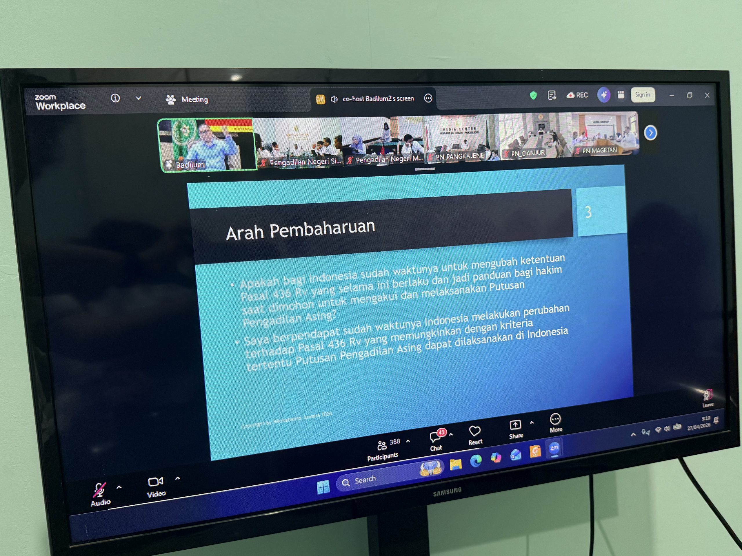 Siak Sri Indrapura – Senin, 27 April 2026 Seluruh Hakim Pengadilan Negeri Siak Sri Indrapura mengikuti kegiatan PERISAI BADILUM Episode 15 yang digelar oleh Direktorat Jenderal Badan Peradilan Umum Mahkamah Agung RI. Kegiatan ini berlangsung secara daring melalui aplikasi Zoom Meeting yang terhubung dengan Command Center Badilum.