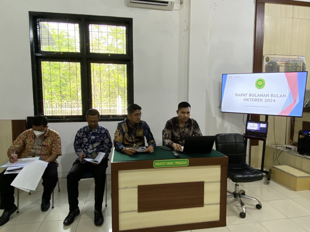Siak Sri Indrapura – Jumat 25 Oktober 2024 Pengadilan Negeri Siak Sri Indrapura melaksanakan Rapat Bulanan Bulan Oktober 2024 di Ruang Media Center. Rapat dipimpin oleh Ketua Pengadilan Negeri Siak Sri Indrapura Bapak Muhammad Hibrian, S.H., dan Wakil Ketua Pengadilan Negeri Siak Sri Indrapura Bapak Ahmad Fadil, S.H., serta diikuti oleh Panitera dan Sekretaris, para Hakim, Pejabat Fungsional dan Struktural, staff dan tenaga PPNPN. Dalam rapat dibahas tentang hasil temuan serta bentuk tindak lanjut yang akan dan sudah dilakukan dalam penyelesaian temuan di masing-masing bagian.