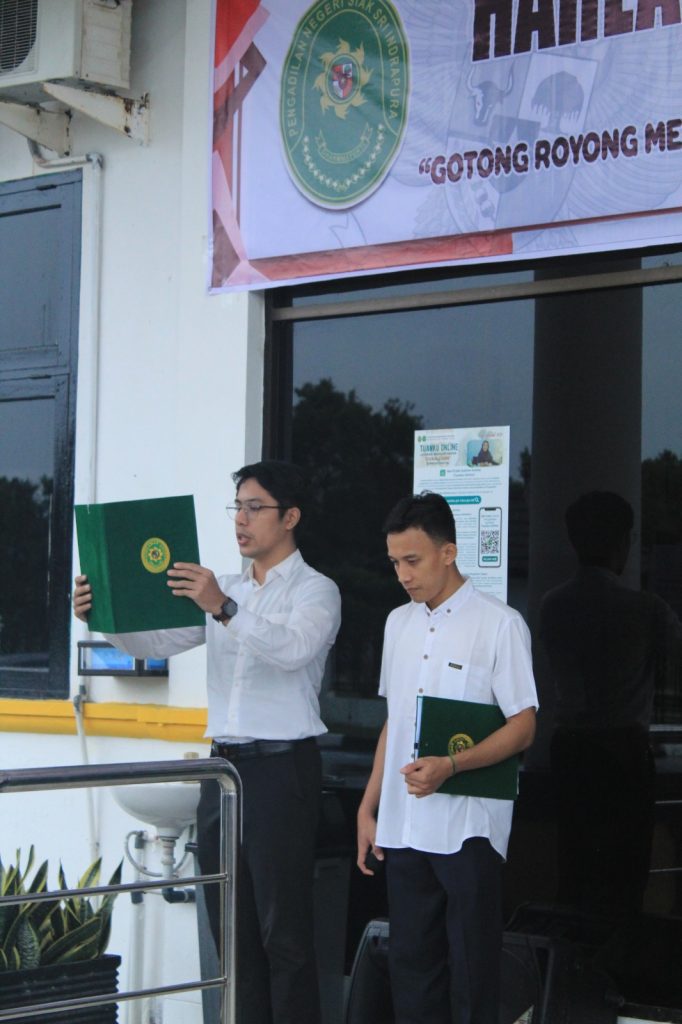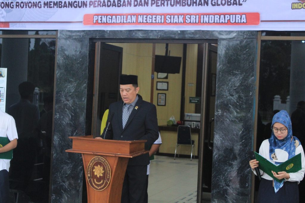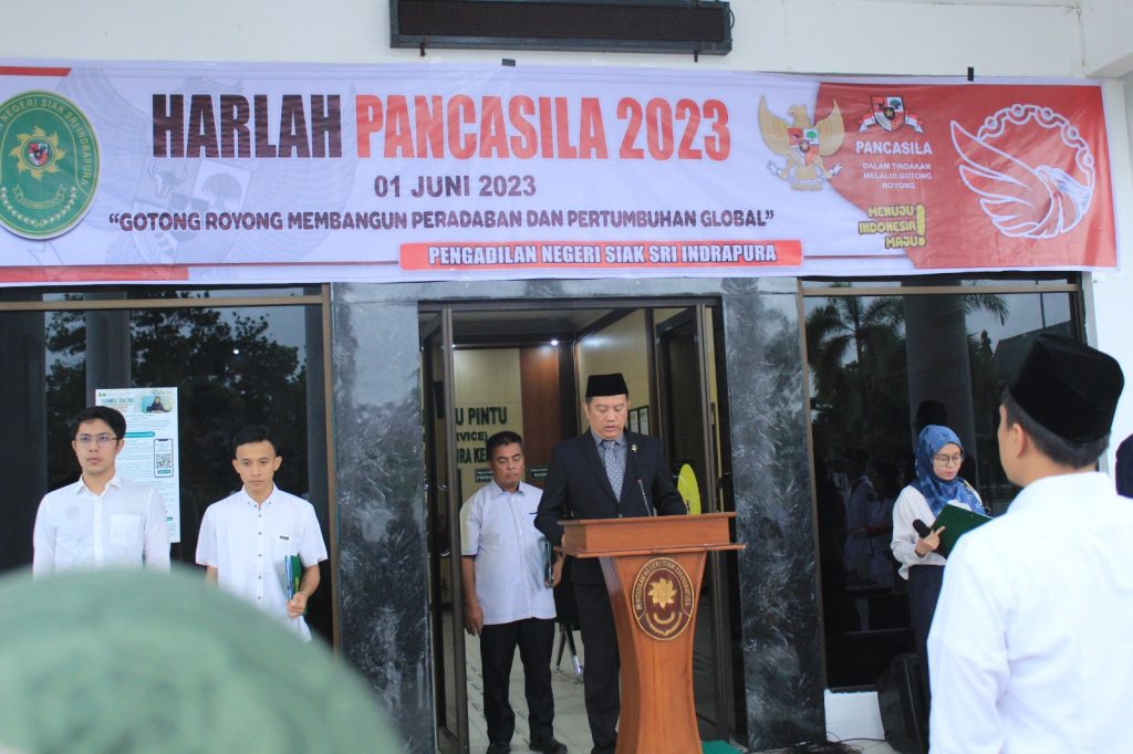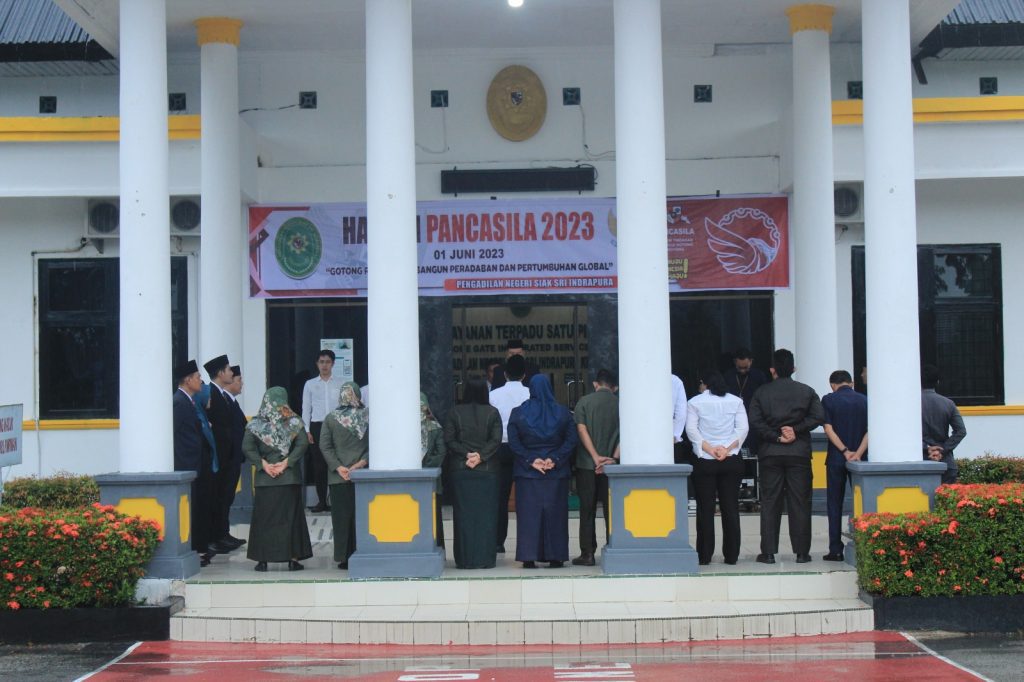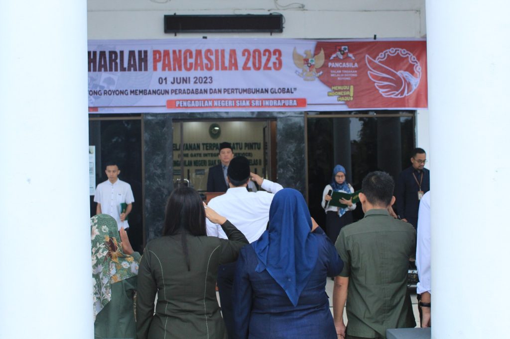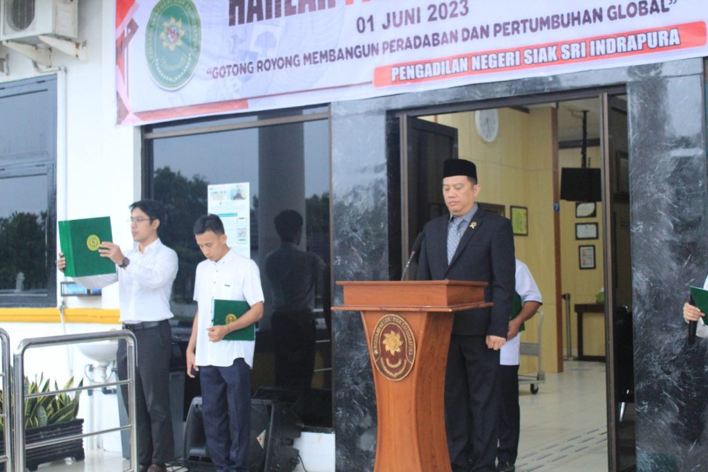 Siak Sri Indrapura – Kamis 01 Juni 2023 Pengadilan Negeri Siak Sri Indrapura melaksanakan Upacara Peringatan Hari Lahir Pancasila Tahun 2023 di Halaman Kantor Pengadilan Negeri Siak Sri Indrapura Kelas II. Upacara dihadiri oleh seluruh keluarga besar Pengadilan Negeri Siak Sri Indrapura. Ketua Pengadilan Negeri Siak Sri Indrapura Bapak Muhammad Hibrian, S.H., selaku pembina upacara menyampaikan amanat upacara dan membacakan amanat upacara dari Presiden Republik Indonesia Bapak Ir. H. Joko Widodo. Meski cuaca yang sedang hujan lebat namun upacara dapat dilaksanakan dengan khidmat dan berjalan lancar.